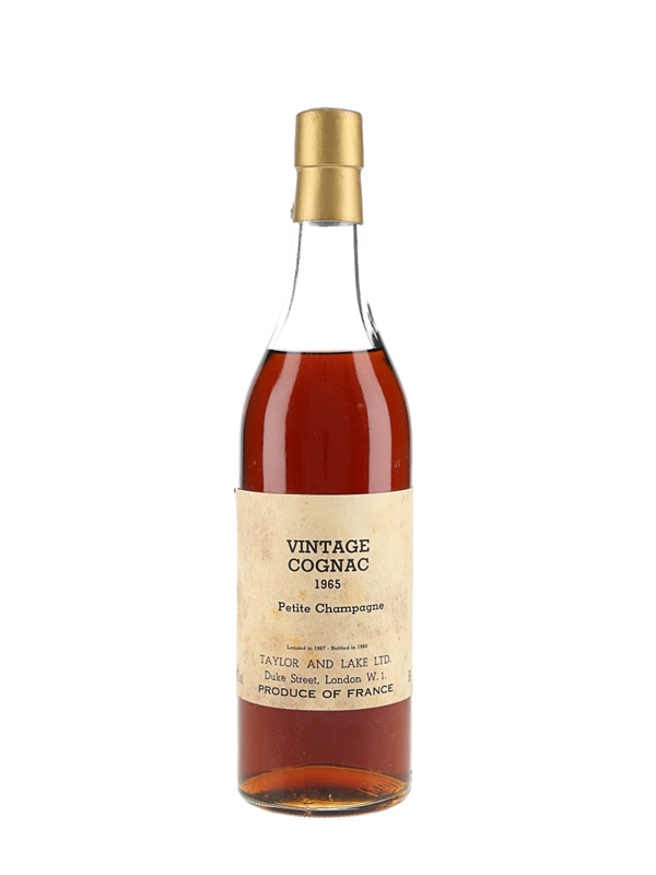 A bottle of Petit Champagne 1965 Vintage Cognac. This was distilled in 1965, landed in the UK in 1967 and bottled in 1980 by Taylor & Lake LTD, Duke Street, London.