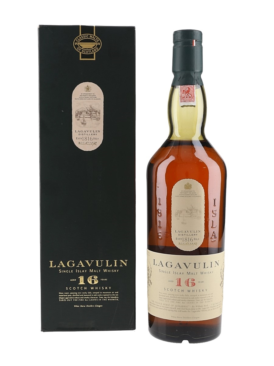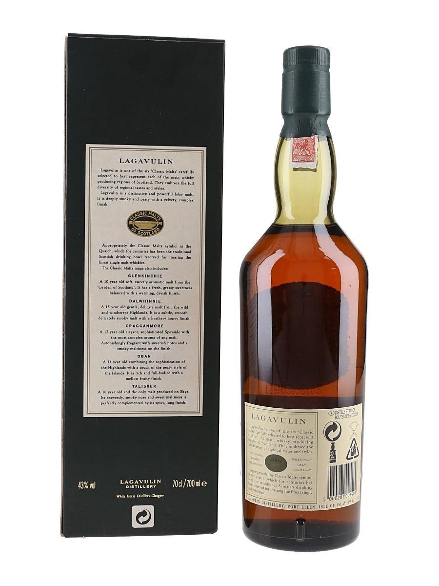 A bottle of Lagavulin 16 Year Old Islay Single Malt Scotch Whisky, part of Diageo's Classic Malts of Scotland range, bottled at 43% ABV. We estimate this was bottled in the late 1990s, when the distillery was still owned by White Horse Distillers.