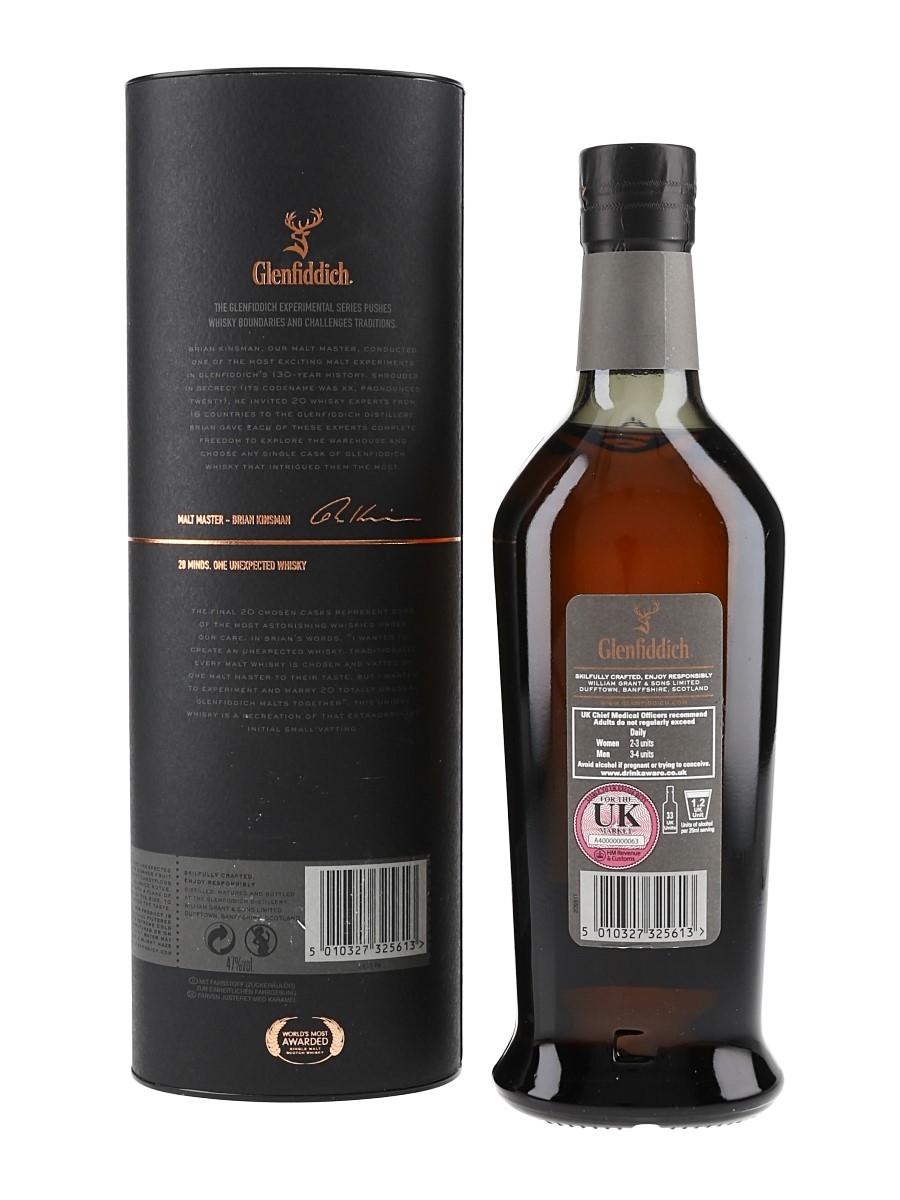 To create this whisky, Glenfiddich Malt Master Brian Kinsman chose 20 whisky experts from around the world and set them loose in Glenfiddich's warehouses, to sample the casks and each choose their favourite. Whisky from these 20 casks was married together to produce this experimental bottling.