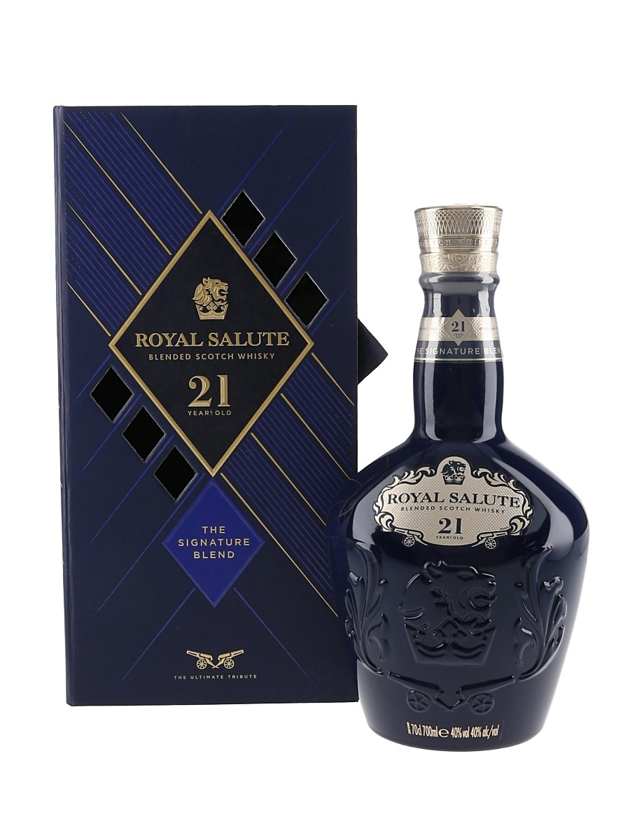 A bottle of Chivas Brothers' Royal Salute 21 Year Old Blended Scotch Whisky, The Signature Blend, presented in a blue Wade porcelain decanter.