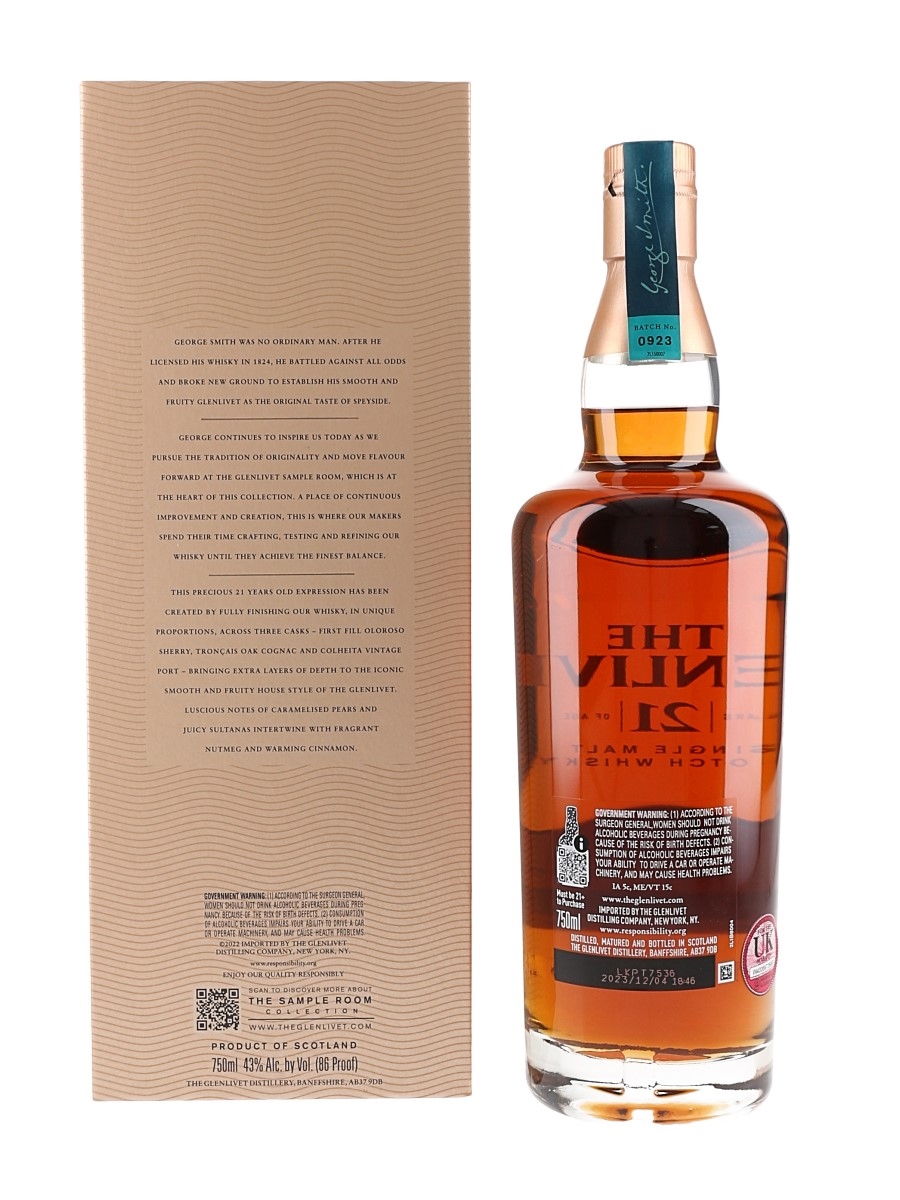 A bottle of Glenlivet 21 Year Old Single Malt Scotch Whisky. This is part of The Sample Room Collection and is finished in first-fill oloroso sherry, cognac and port casks.