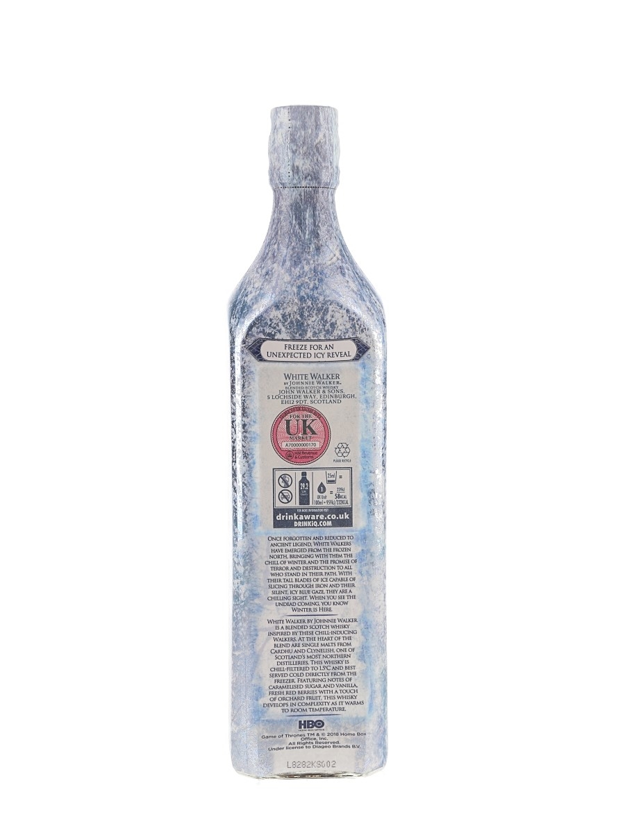 A bottle of Johnnie Walker White Walker Limited Edition Blended Scotch Whisky with malts from Cardhu and Clynelish at its heart. This blend was inspired by Game of Thrones and is designed to be drunk straight from the freezer.