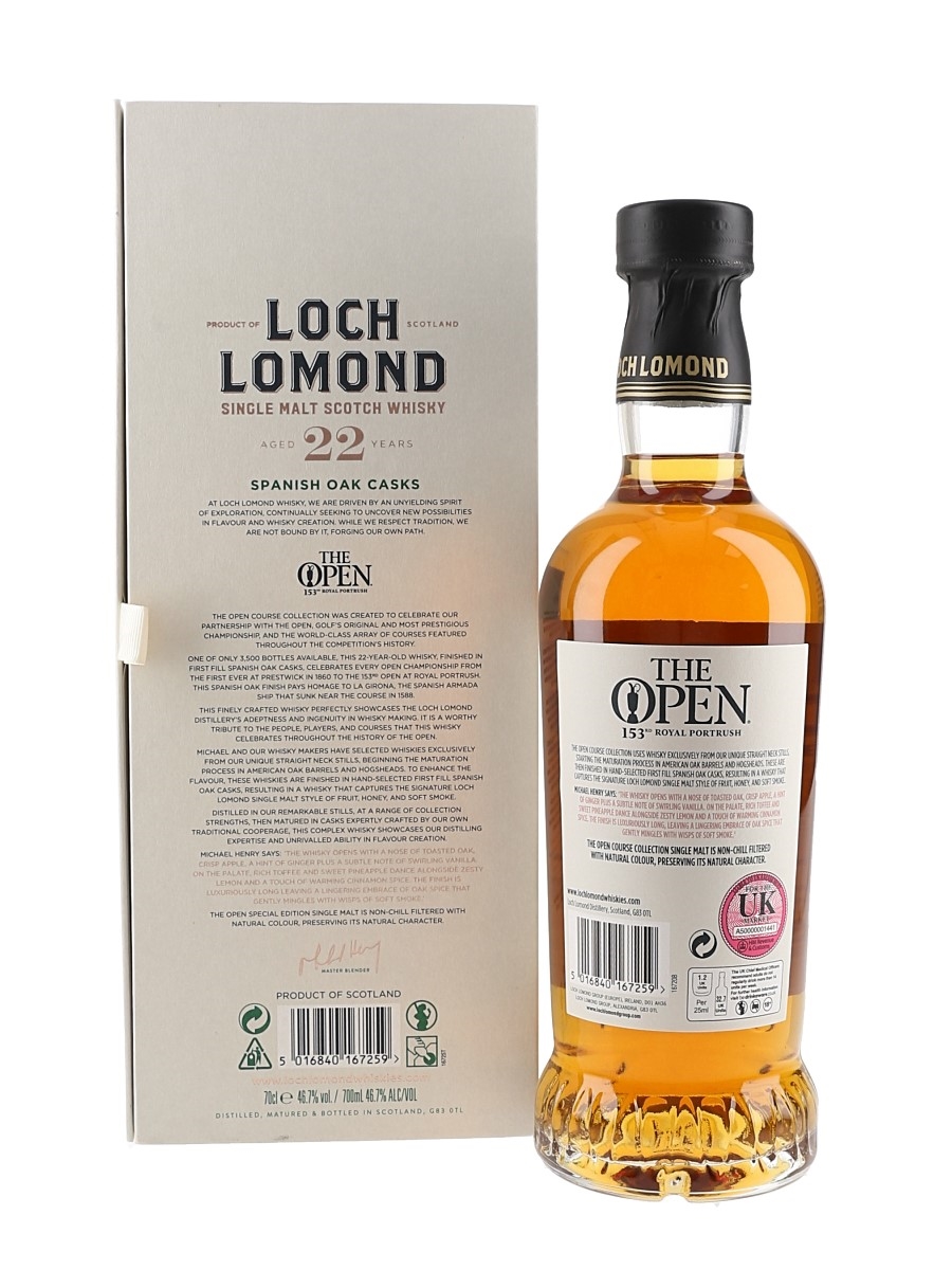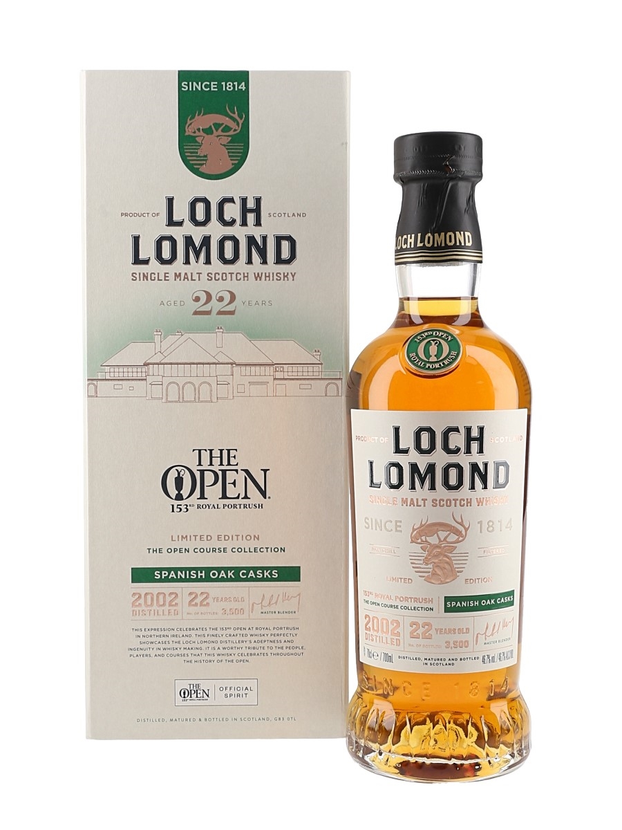 A bottle of Loch Lomond 22 Year Old Highland Single Malt Scotch Whisky. This was distilled in 2002, matured in Spanish oak casks and bottled for the 153rd The Open Course Collection, celebrating the distillery's partnership with The Open, golf's original championship. This is the Royal Portrush edition. The bottling code indicates this was bottled on 12 December 2024.