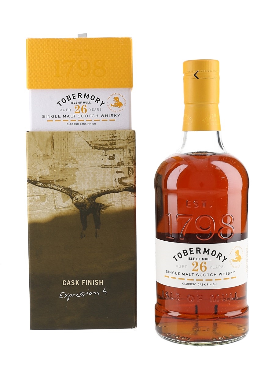 A bottle of Tobermory 26 Year Old Single malt Scotch whisky. This was finished in a oloroso cask and bottled at 49.2% ABV.