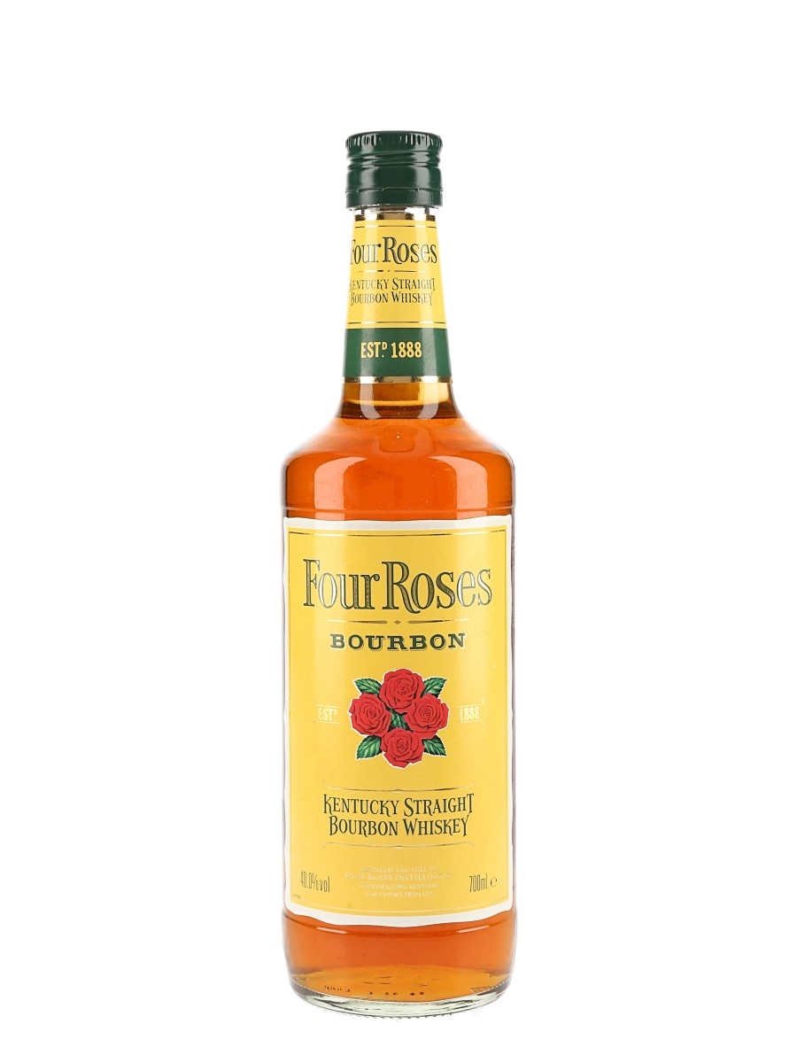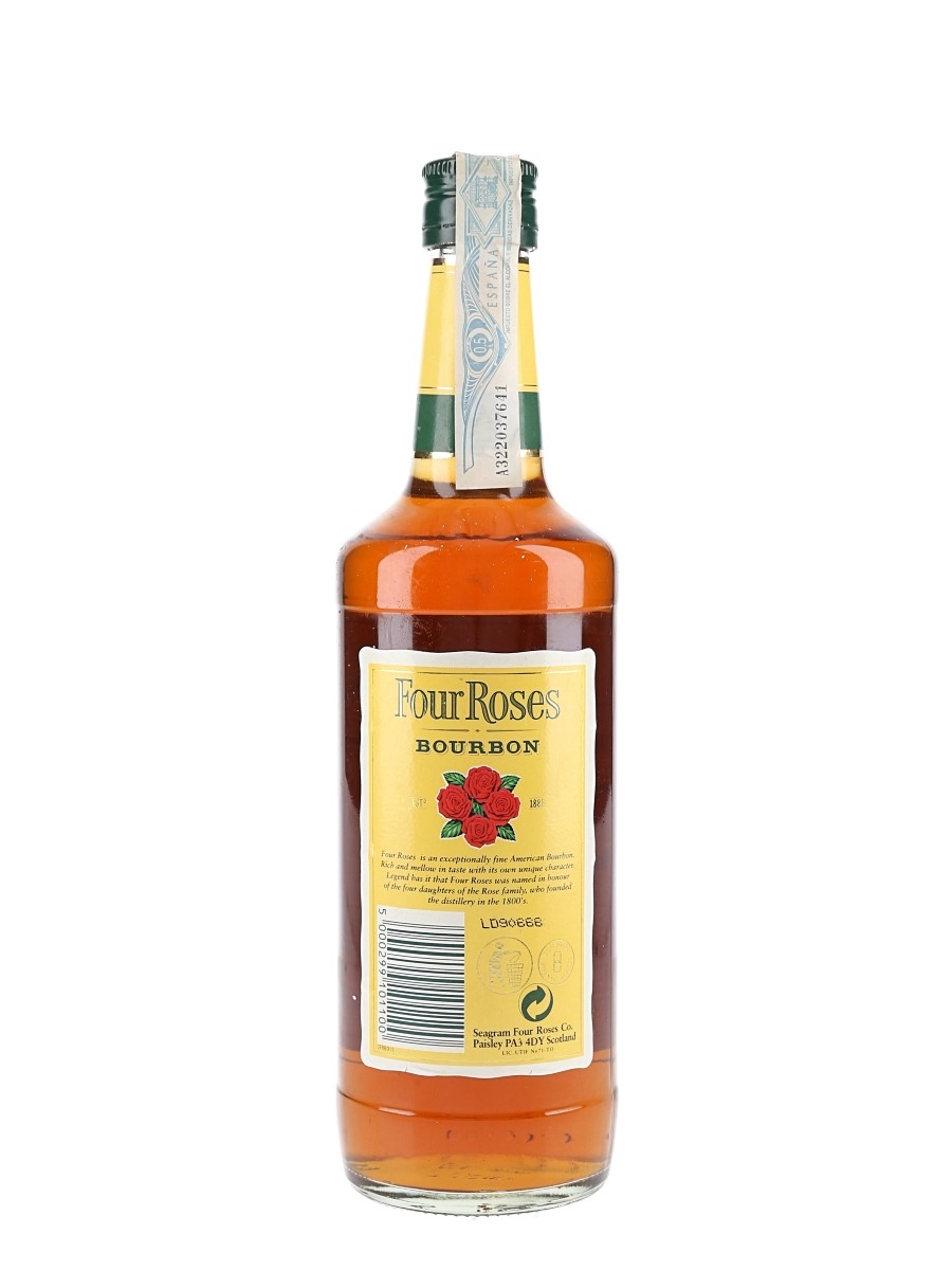 A bottle of Four Roses Kentucky Straight Bourbon Whiskey, distilled and aged in Kentucky. We estimate this was bottled in the 1990s.