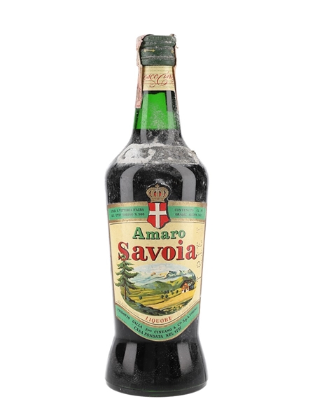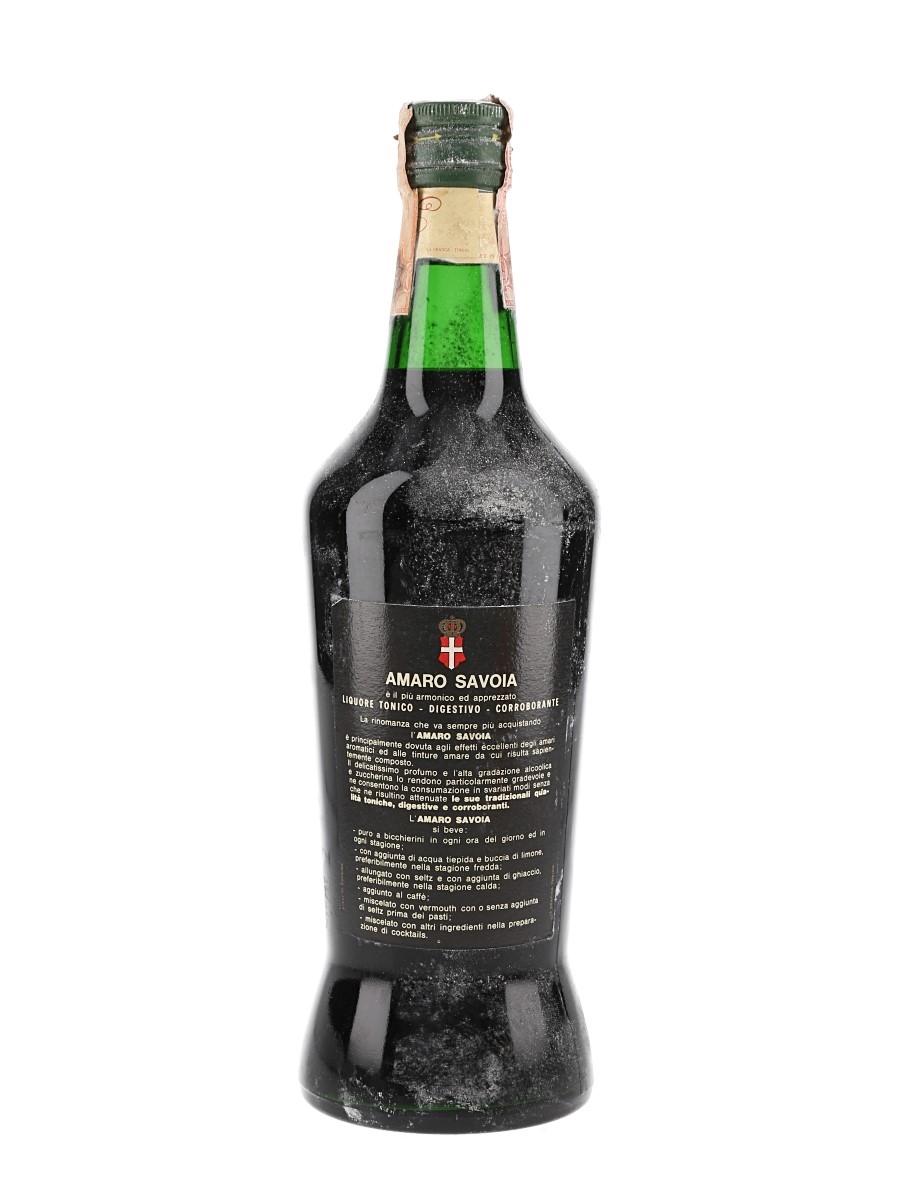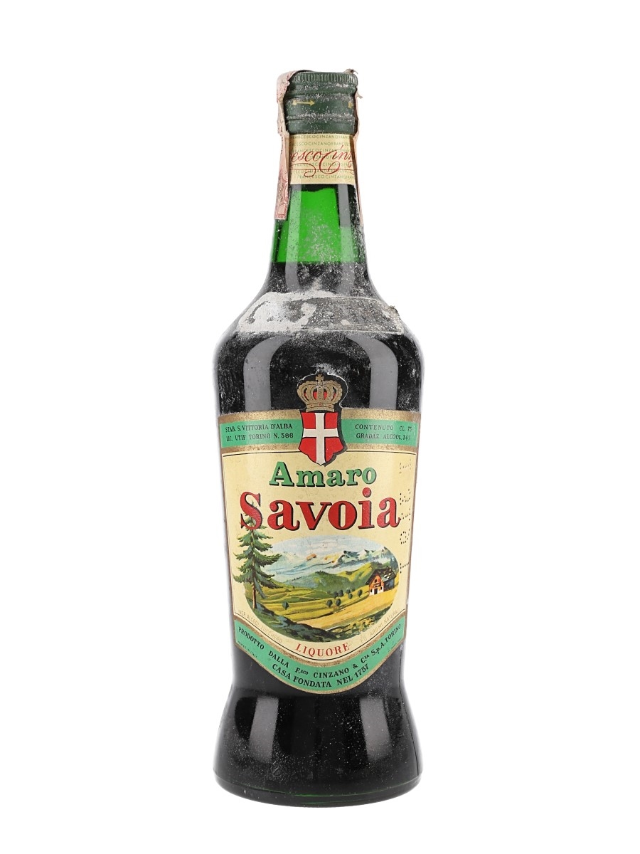 A bottle of Amaro Savoia, a bitter tonic liqueur produced in S. Vittoria D'Alba, Italy, and produced by Cinzano and bottled at 34% ABV. We estimate this was bottled in the 1970s.