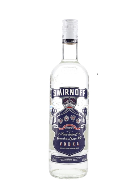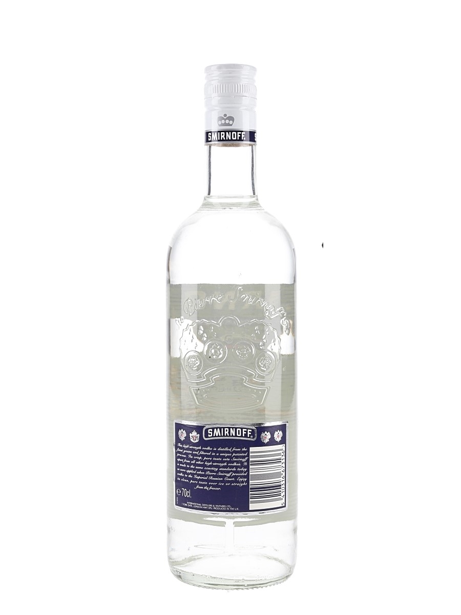 A bottle of Smirnoff Blue Label, distilled from premium grain and bottled at 45% ABV. This was produced in the UK.