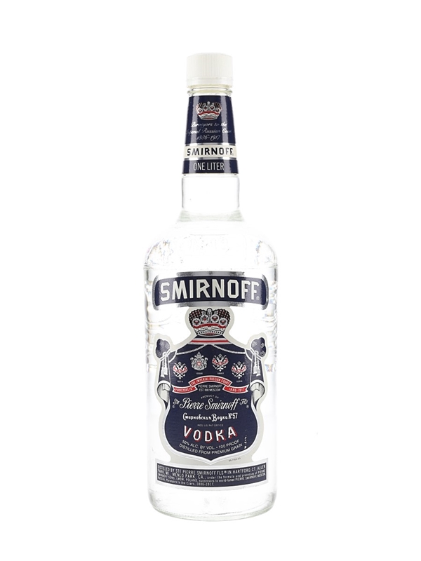 A litre bottle of Smirnoff Blue Label Vodka. This was produced in the USA, we estimate in the early 1990s.