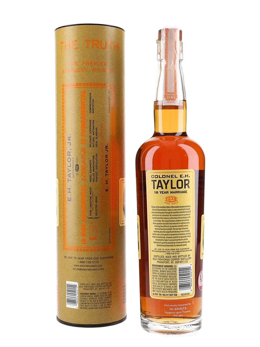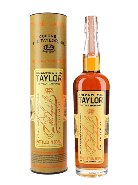 A bottle of Colonel E H Taylor 18 Year Marriage Straight Kentucky Bourbon Whiskey, distilled by Old Fashioned Cooper distillery and bottled in bond at 100 proof (50% ABV).