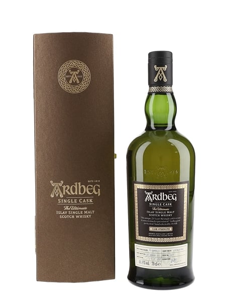 A bottle of Ardbeg 21 Year Old Single Malt Scotch Whisky. This was distilled on 18 September 2000, matured in a first fill bourbon barrel before and bottled on 27 September 2021 as part of the Single Cask series.
