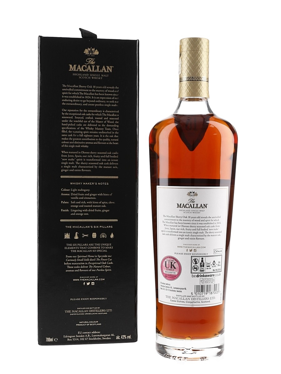 A bottle of The Macallan 18 Year Old Highland Single Malt Scotch Whisky. This was matured exclusively in hand-picked sherry seasoned oak casks from Jerez, Spain, and bottled at 43% ABV for the annual release in 2022.