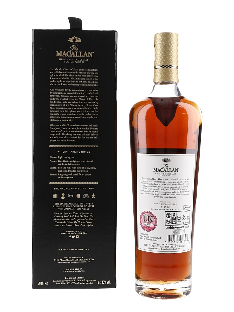 A bottle of The Macallan 18 Year Old Highland Single Malt Scotch Whisky. This was matured exclusively in hand-picked sherry seasoned oak casks from Jerez, Spain, and bottled at 43% ABV for the annual release in 2022.