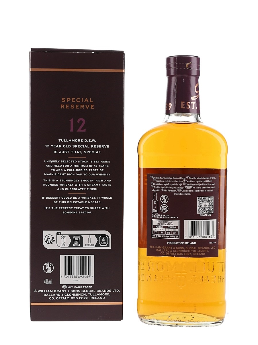 A bottle of Tullamore Dew 12 Year Old Irish Whiskey. The bottling code indicates this was bottled on 16 April 2024.