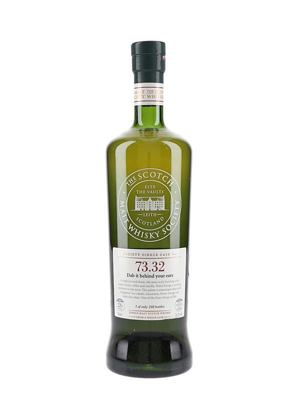 A bottle of Aultmore 26 Year Old Single Cask Single Malt Scotch Whisky from the Scotch Malt Whisky Society. This was matured in a refill bourbon hogshead and bottled at 56.2% ABV.