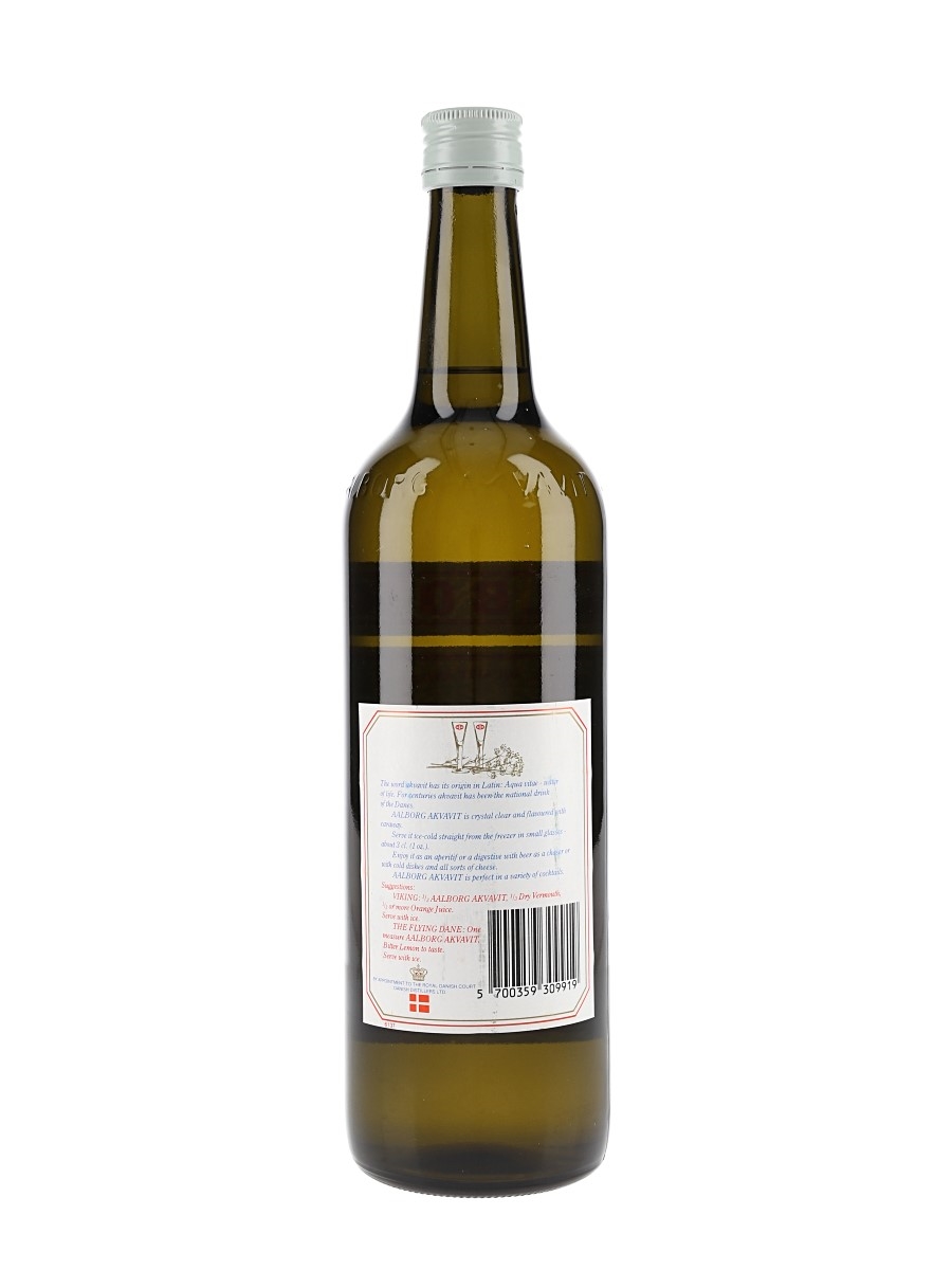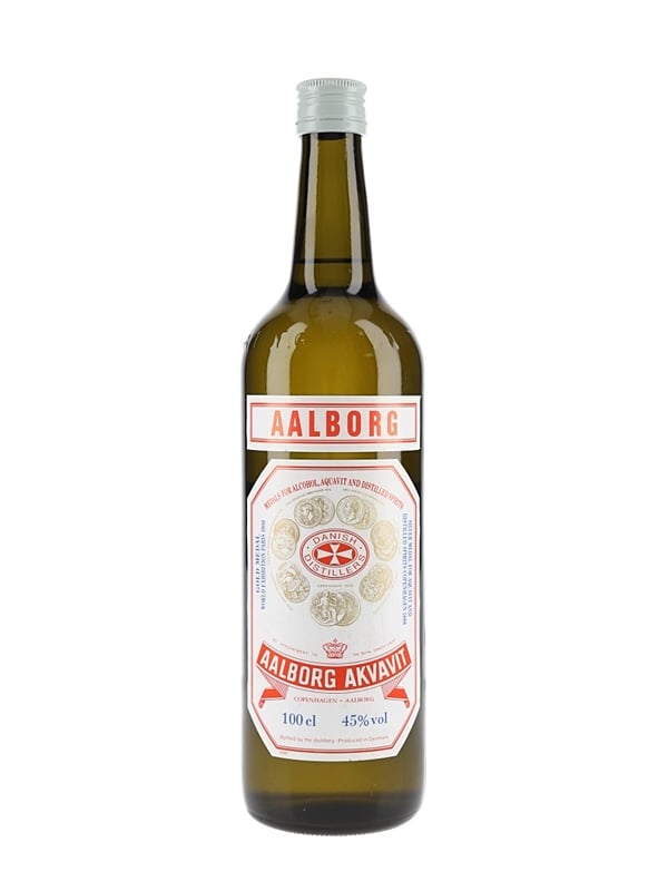 A litre bottle of Aalborg Akvavit produced in Denmark.