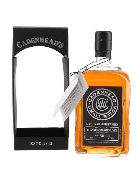A bottle of Convalmore 36 Year Old Speyside Single Malt Scotch Whisky. This was distilled in 1977, aged in a hogshead cask, and bottled at cask strength of 58.2% ABV in 2013 by Cadenhead's for their Small Batch range.
