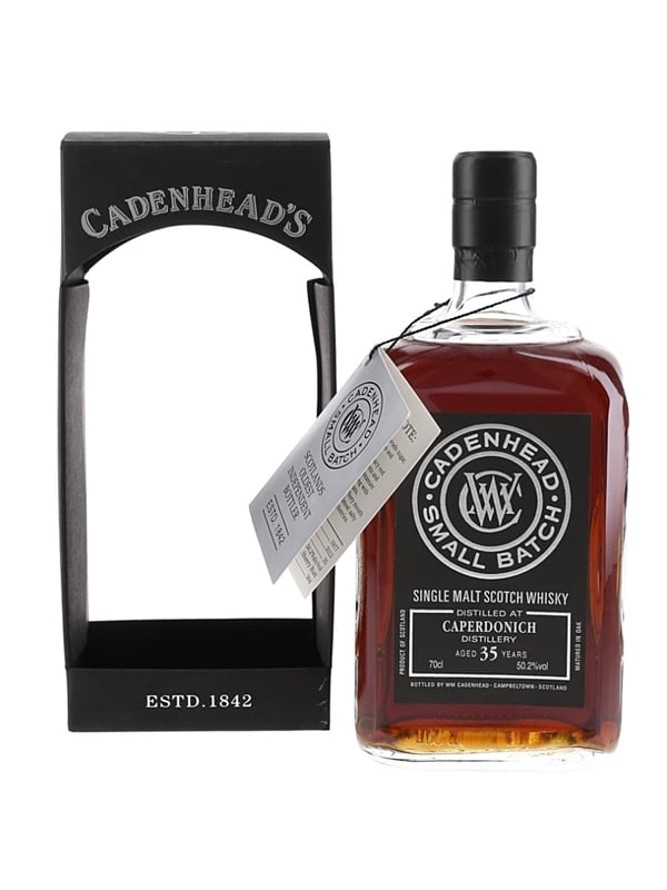 A bottle of Caperdonich 35 Year Old Speyside Single Malt Scotch Whisky. This was distilled in 1977, matured in a sherry butt cask, and bottled at cask strength of 50.2% ABV in 2013 by Cadenhead's for their Small Batch range.