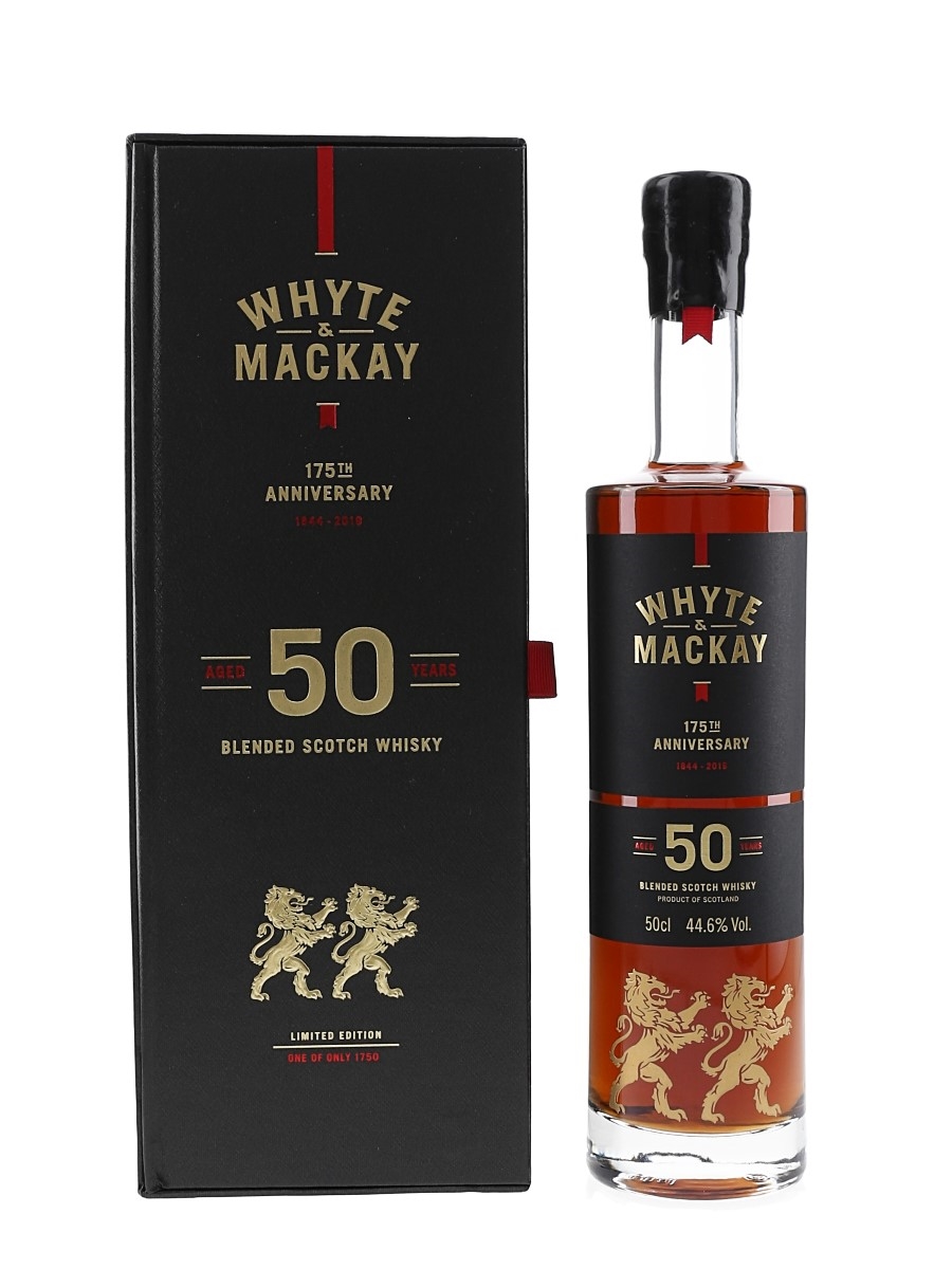 A 50cl bottle of Whyte & Mackay 50 Year Old Blended Scotch Whisky. This was distilled in 1966 and matured in a combination of bourbon barrels, matusalem first and second fill sherry butts, tawny port pipe and Apostoles sherry butts from Gonzalez Byass. This was released in 2019 to commemorate the 175th anniversary of Whyte & Mackay Distillers.