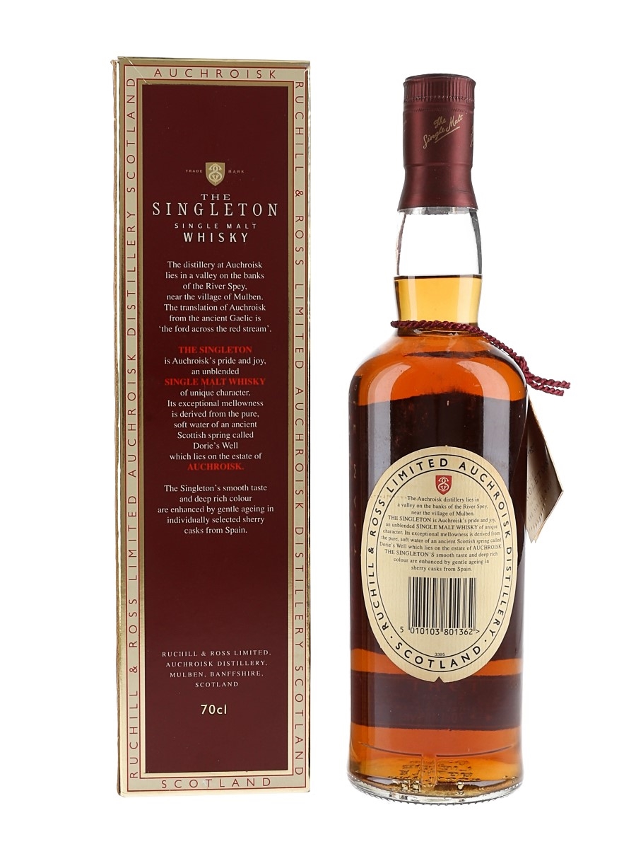 A bottle of The Singleton of Auchroisk Single Malt Scotch Whisky distilled in 1981 by Ruchill & Ross Limited. We estimate this was bottled in the 1990s.