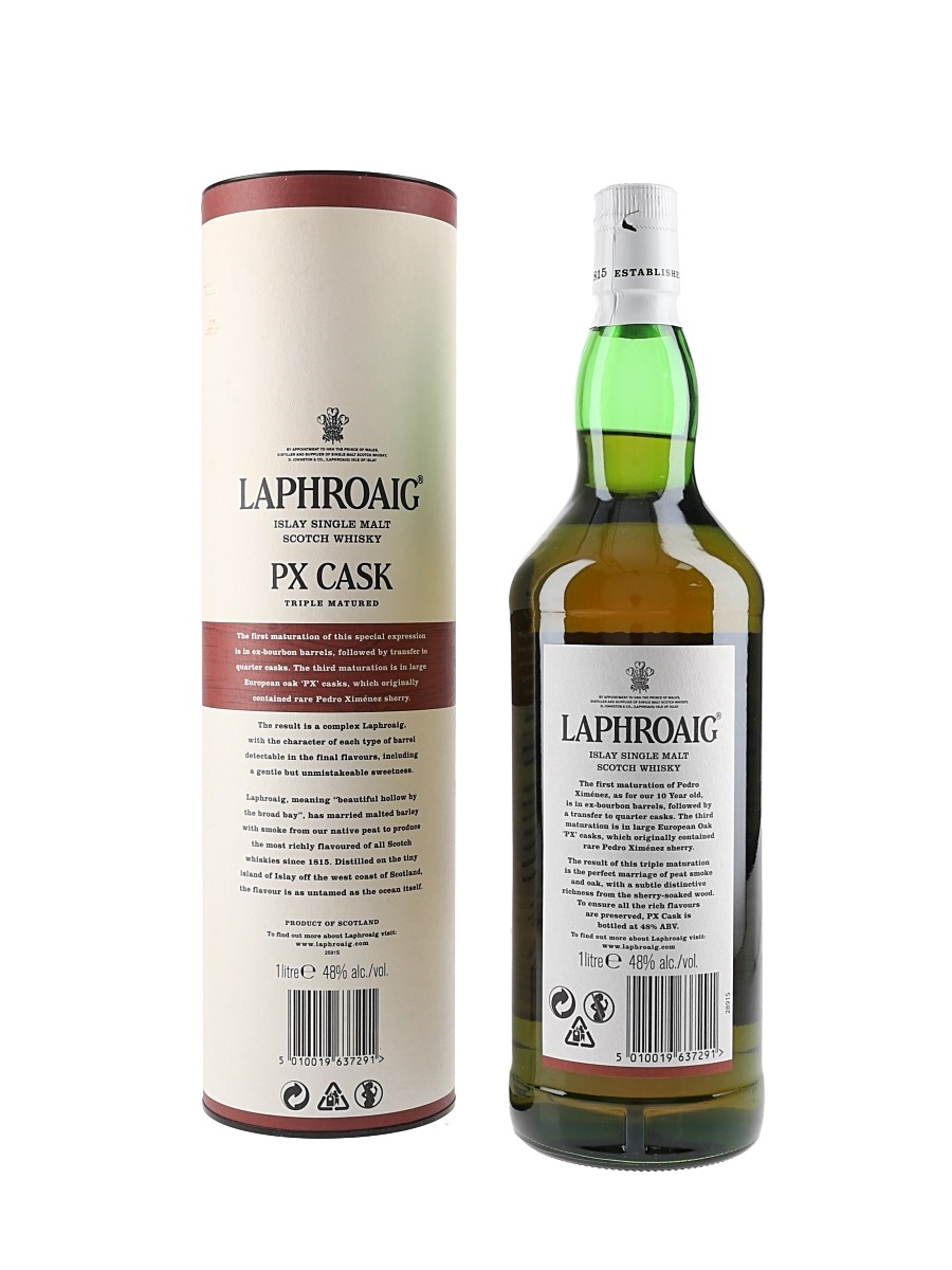 A litre bottle of Laphroaig PX Cask single malt Scotch whisky, released for the travel retail market. This was matured in American oak and then in quarter casks before a final finishing period in ex-Pedro Ximenez sherry casks.