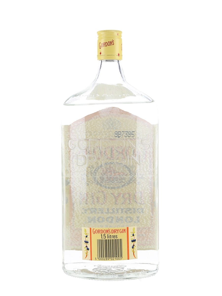 A 150cl bottle of Gordon's Dry Gin distilled and bottled in London by Tanqueray Gordon & Co. Ltd. We estimate this was bottled in the 1980s.