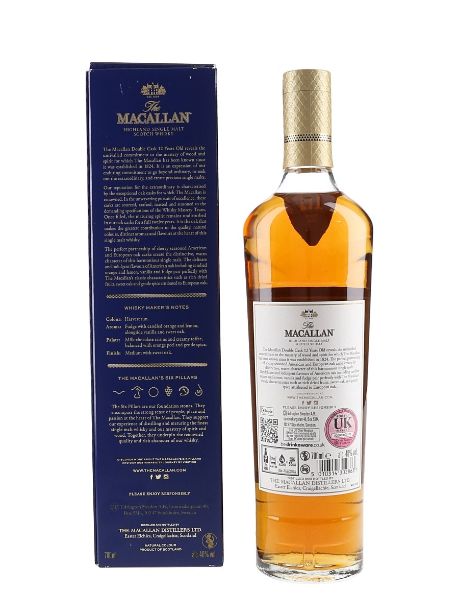 A bottle of The Macallan 12 Year Old Double Cask Highland Single Malt Scotch Whisky. This was matured in a combination of sherry seasoned American and European oak casks.