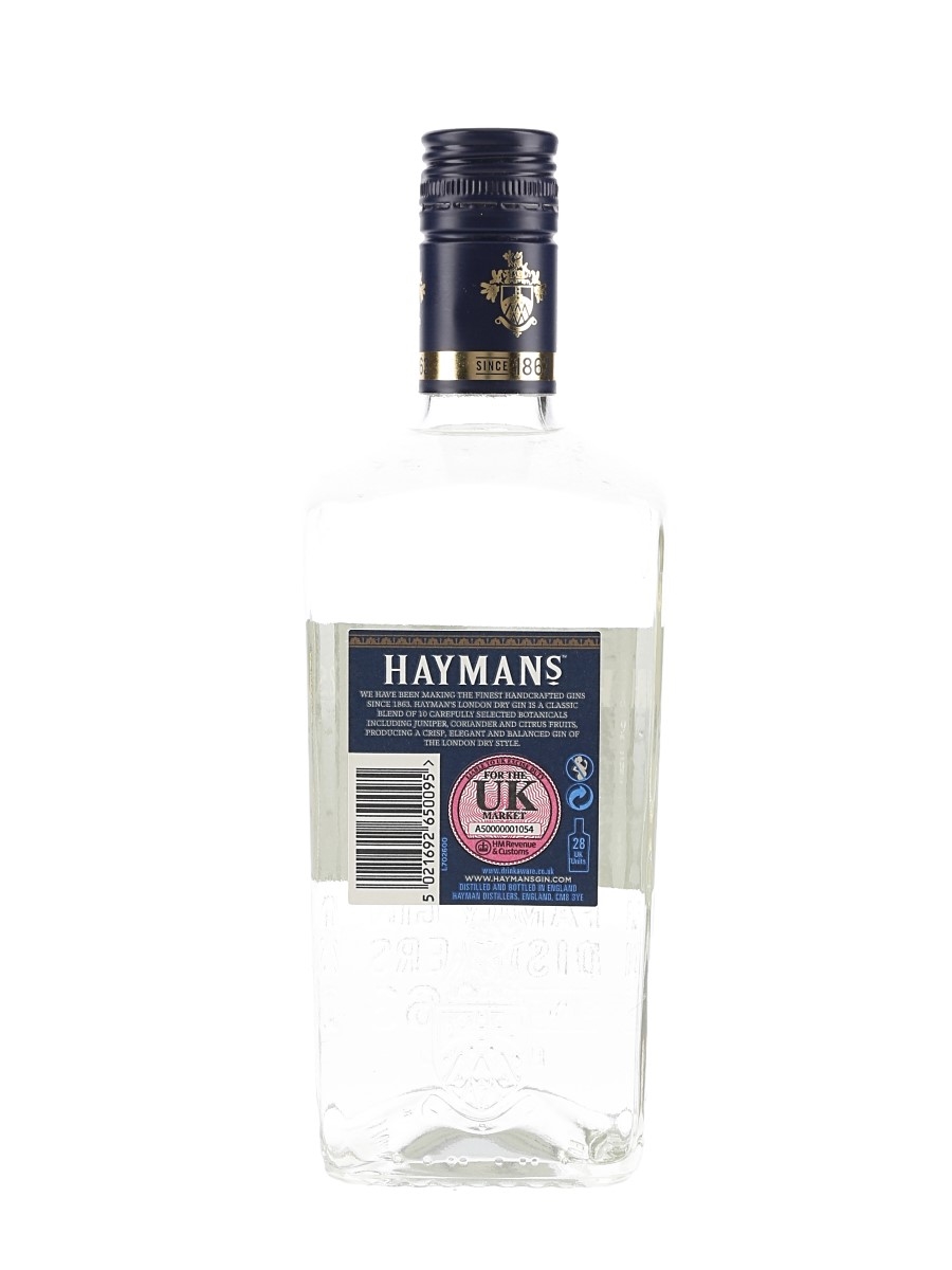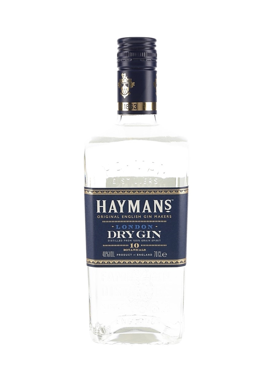 A bottle of Hayman's London Dry Gin, distilled and bottled in England at 40% ABV and infused with ten botanicals.