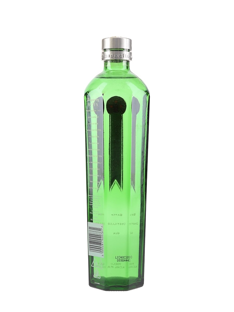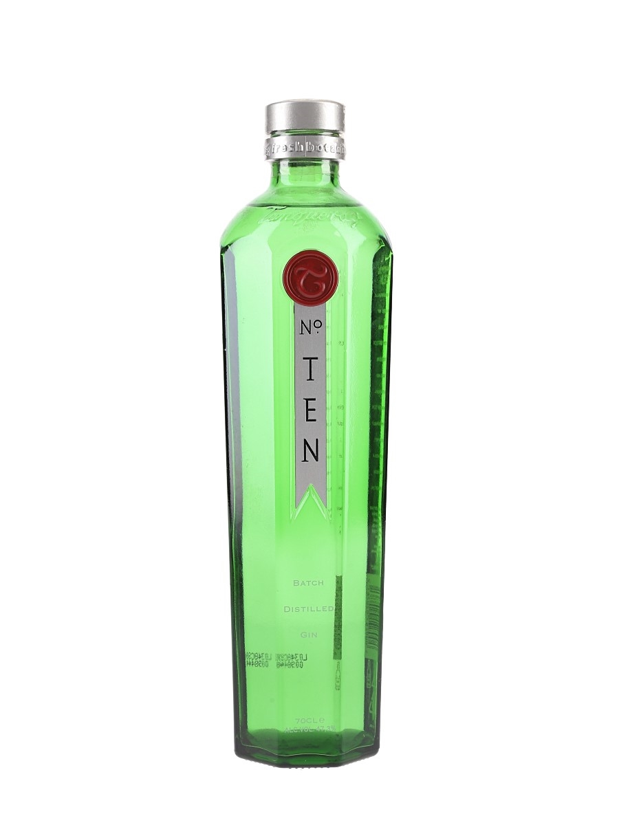 A bottle of Tanqueray No.Ten small batch gin distilled with Export Quality. This was named after the No. 10 still in which it was made. This was produced in Britain for Charles Tanqueray & Co. Lakeside Drive, Park Royal, London.