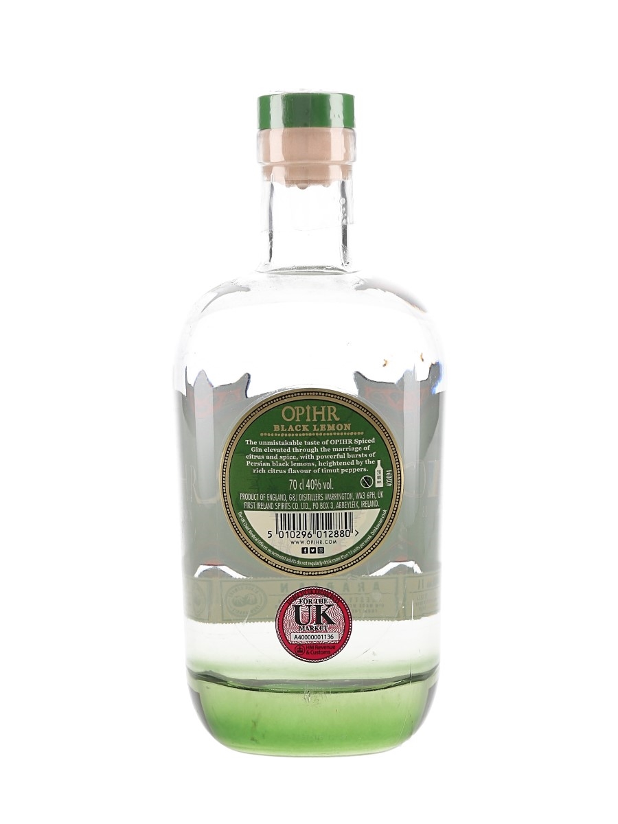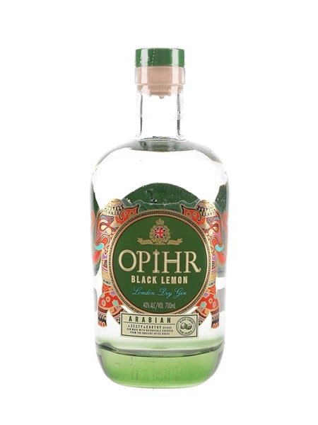 A bottle of Opihr London Dry Gin Black Lemon produced by G&J Distillers, England.