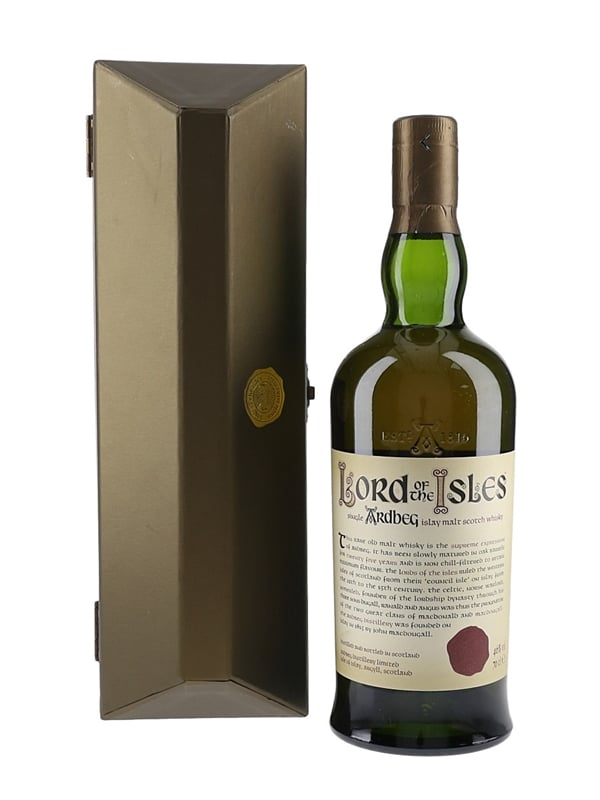 A bottle of Ardbeg Lord of the Isles Single Islay Malt Scotch Whisky, matured for 25 years and bottled at 46% ABV. It was first launched in 2001 and production continued until 2007. This is presented with a scroll telling the story of Somerled, a Celtic-Norse warlord and the first Lord of the Isles.