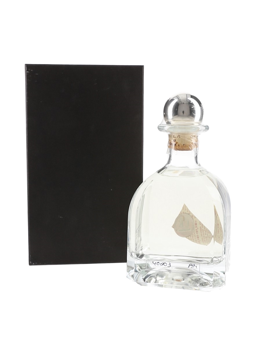 A bottle of Gran Patron Platinum, a premium Tequila made from 100% Weber blue agave. The agave is hand-selected for its high sugar content, steamed, crushed, fermented and distilled using traditional techniques. This Tequila is triple distilled, and matured in oak casks for a short time before filtering to remove the colour obtained from the cask. Each bottle is hand-polished and numbered.