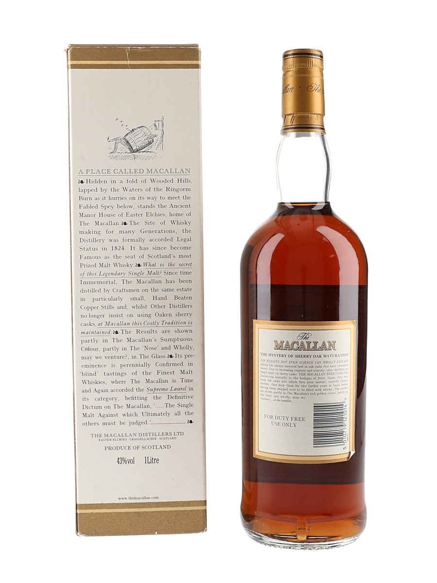 A litre bottle of The Macallan 12 Year Old Single Highland Malt Scotch Whisky, matured in sherry wood. This was bottled for duty free stores, we estimate in the 1990s.