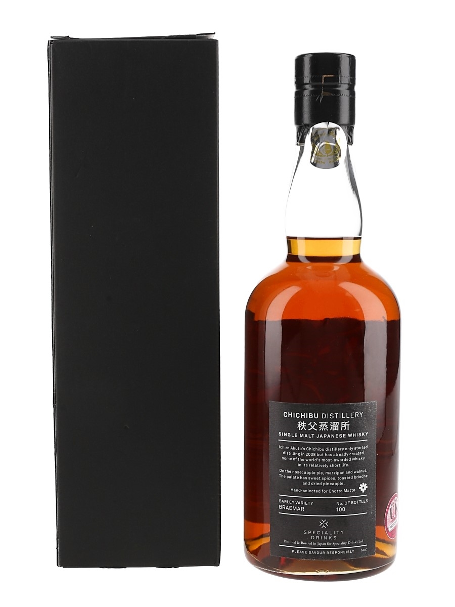 A bottle of Chichibu 2012 Single Malt Japanese Whisky. This was distilled in 2012, matured in a single virgin oak barrel and bottled at cask strength in 2022. It was selected for Chotto Matte by Speciality Drinks and features artwork displaying the restaurant and bar group's signature fusion of 'Tokyo urban vibe with Miami's tropical life'.