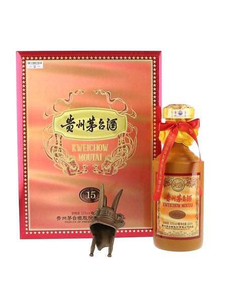 A 50cl bottle of Kweichow Moutai 15 Year Old baijiu, presented with a metal cup. The bottling code indicates this was bottled in 2023.