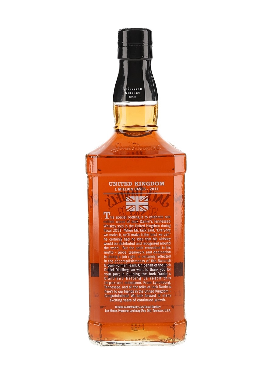 A bottle of Jack Daniel's, which was bottled in 2011 to celebrate the distillery reaching its 1 million case mark in the United Kingdom.
