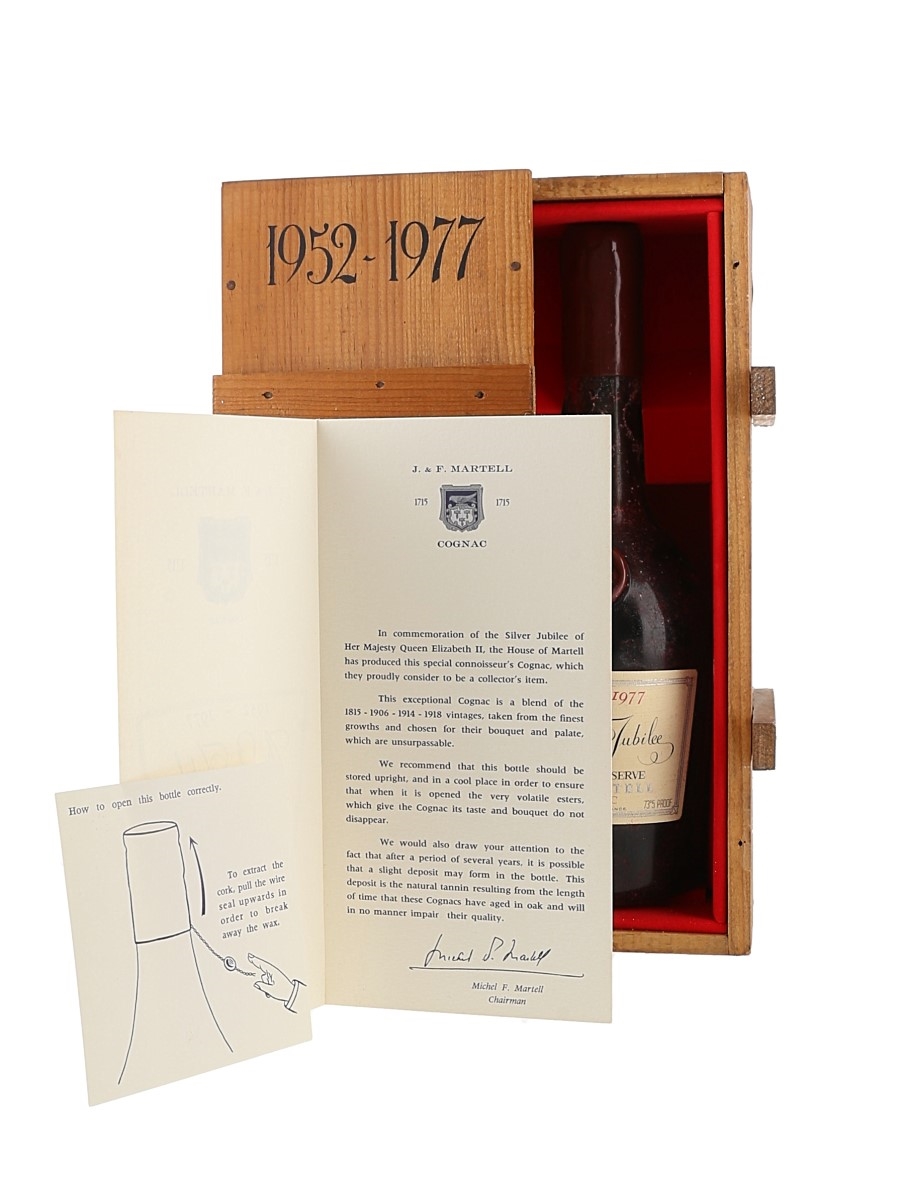 A bottle of Martell The Silver Jubilee (1952-1977). Produced to commemorate the Queen's Silver Jubilee in 1977, this Cognac is blended from the 1815, 1906, 1914 and 1918 vintages. Chairman Michel F. Martell said at the time that these eaux-de-vie used were 'from the finest growths and were chosen for their bouquet and palate, which are unsurpassable'.