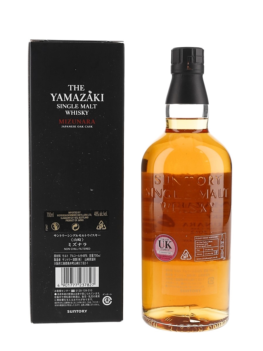 A bottle of The Yamazaki Mizunara Single Malt Whisky produced by Suntory in Japan. A part of The Yamazaki's 2012 annual Cask Collection release, this was matured in Japanese oak which is officially known as Quercus Mongolicus.