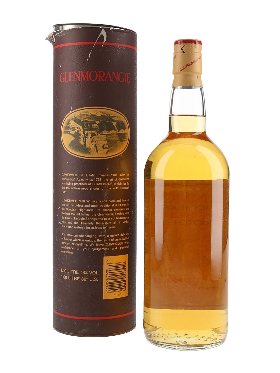 A litre bottle of Glenmorangie 10 Year Old Single Highland Malt Scotch whisky. We estimate this was bottled in the 1980s.