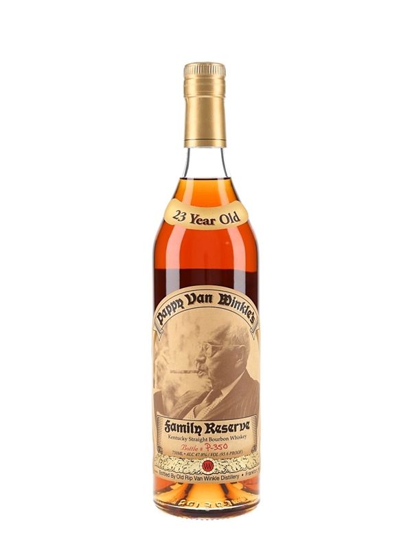 A bottle of Pappy Van Winkle's 23 Year Old Family Reserve Kentucky Straight Bourbon Whiskey, bottled by Old Rip Van Winkle Distillery, Frankfort. This was imported to England by Hi-Spirits Ltd.
