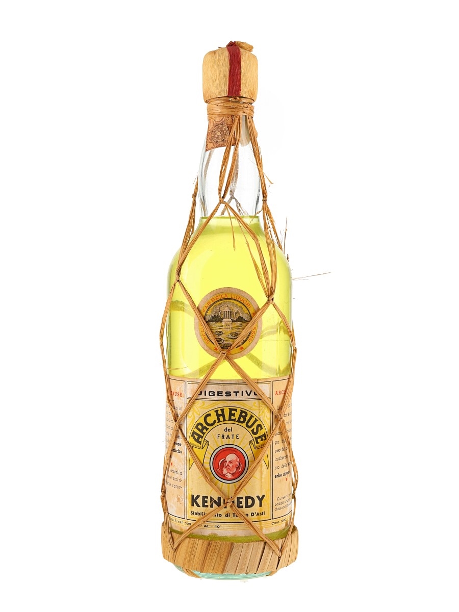 A litre bottle of Archebuse de Frate Kennedy from Italy, produced by Fabbrica Liquori. We estimate this was bottled in the 1960s-1970s.