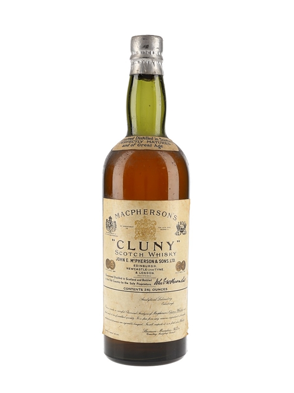 A 75.3cl bottle of Macpherson's Cluny Scotch Whisky, blended by John E McPherson & Sons Ltd. We estimated this was bottled in the late 1930s to early 1940s.