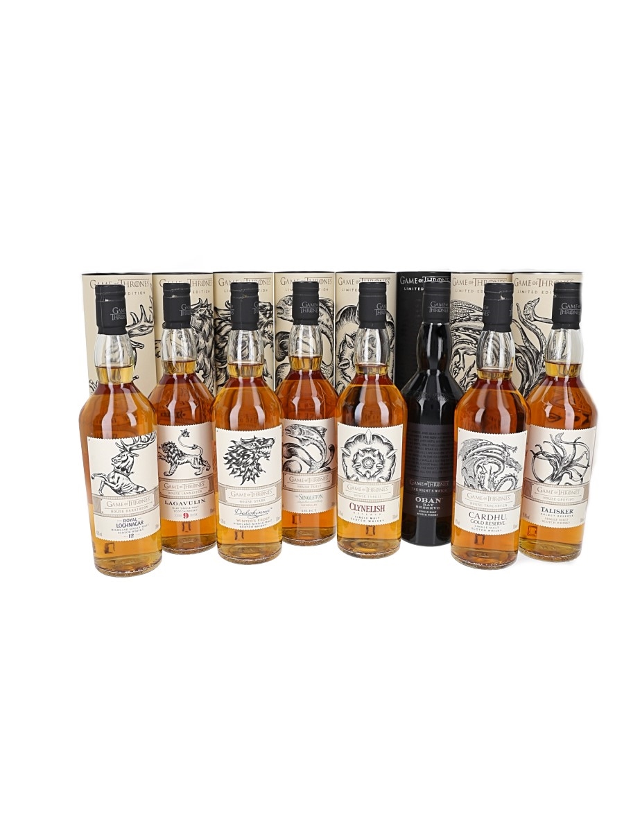 This lot contains a set of eight bottles of Single Malt Scotch Whisky from Diageo's Game of Thrones series. Each bottle in the series is named for one of the Great Houses of Westeros, the Six Kingdoms and The Night's Watch:
