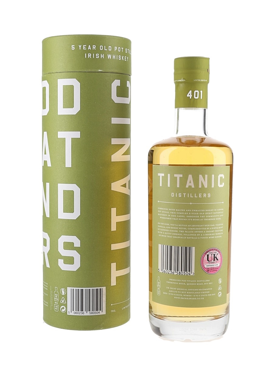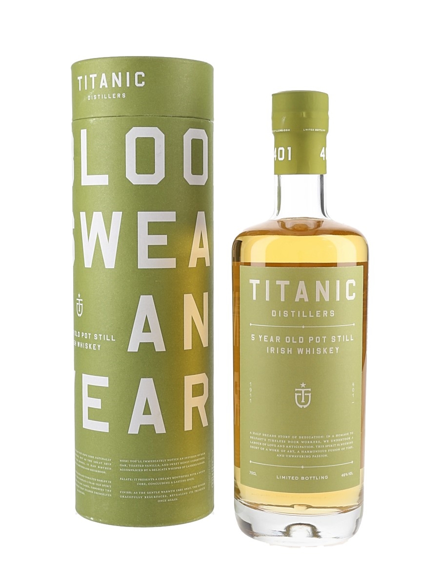 A bottle of Titanic 5 Year Old Irish whiskey, named after the ill-fated ocean liner which was built by the Harland and Wolff shipyard in Belfast.