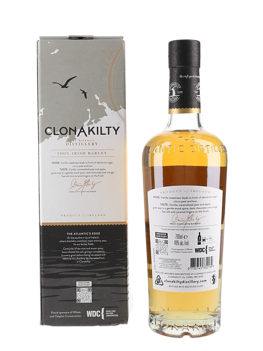 A bottle of Clonakilty Irish Whiskey. This was matured in a marriage of Ex-bourbon, Oloroso and Amontillado at Clonakilty Distillery, Co. Cork ,at the distillery's Atlantic ocean warehouse.