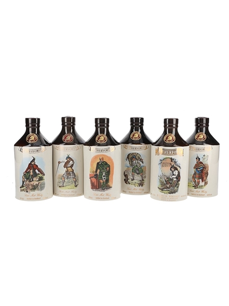 This lot contains six 37.5cl bottles of Rutherford's Clansman Straight Scotch Malt Whisky, presented in a porcelain decanter.