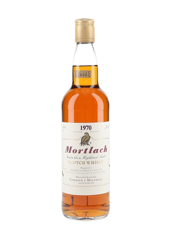 A bottle of Mortlach Pure Highland Malt Scotch Whisky. This was distilled in 1970 and bottled by Gordon & MacPhail in 2000.
