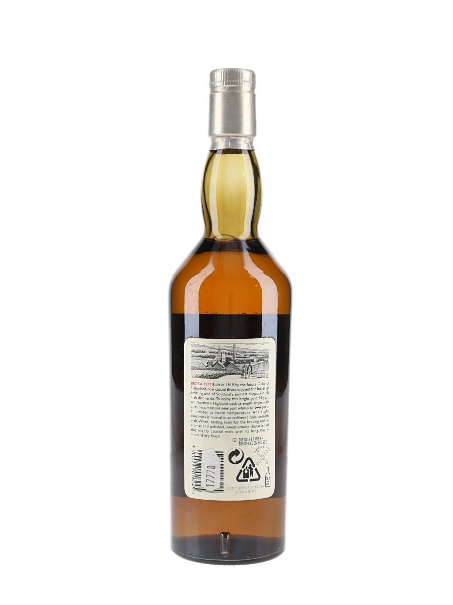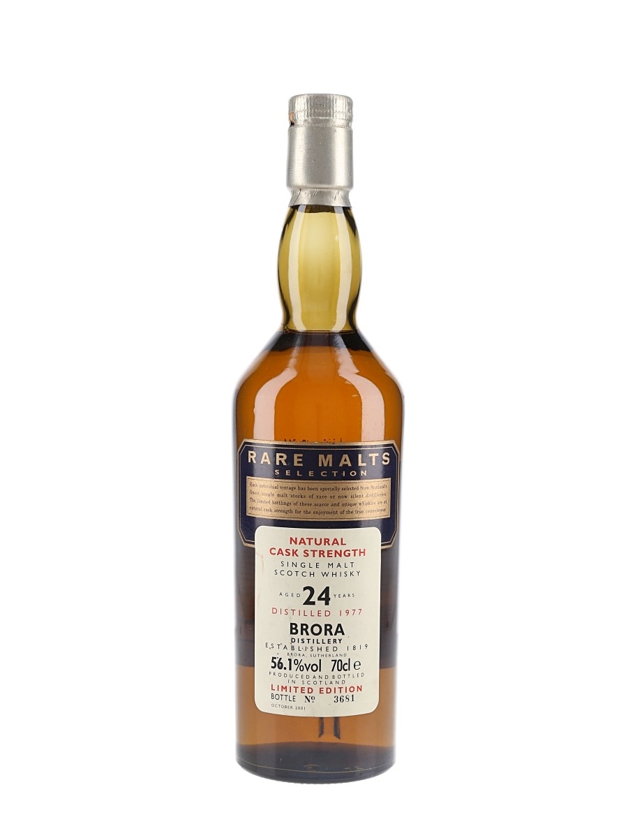 A bottle of Brora 24 Year Old Single Malt Scotch Whisky. This was distilled in 1977 and bottled at a natural cask strength of 56.1% ABV in October 2001 for Diageo's now discontinued Rare Malts Selection range.