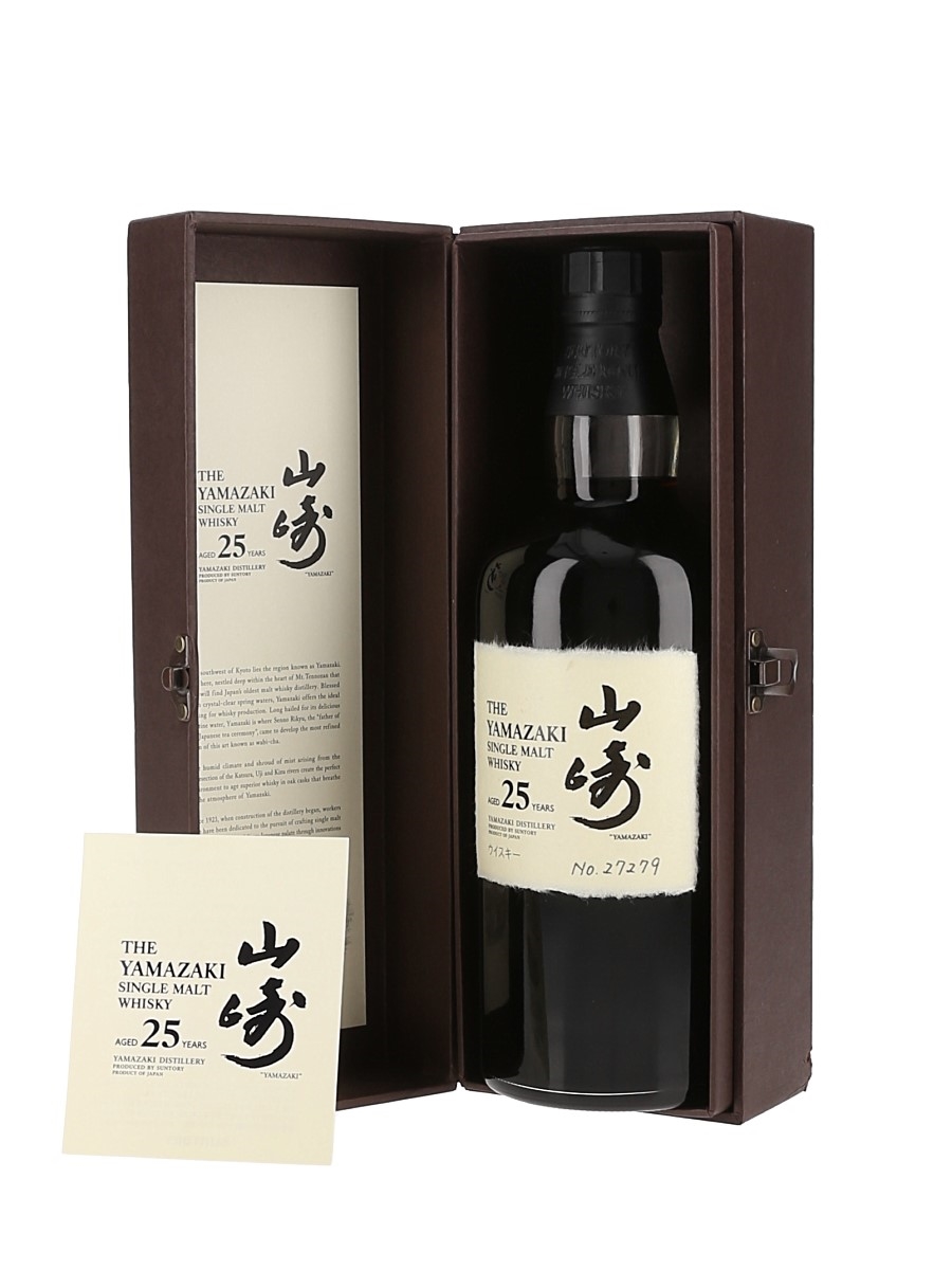 A bottle of The Yamazaki 25 Year Old Single Malt Whisky from Japan, matured in sherry casks. This is bottle number 27279.