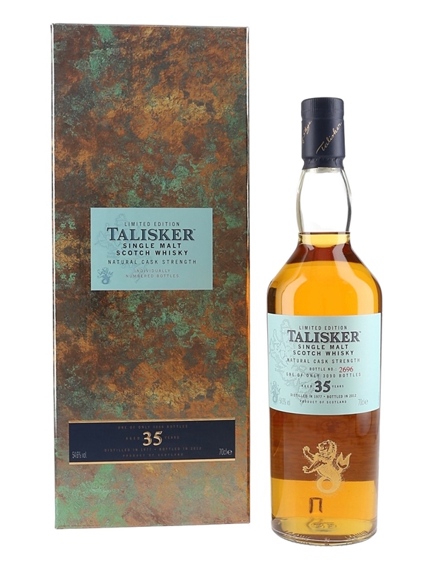 A bottle of Talisker 35 Year Old limited edition Island Single Malt Scotch Whisky. This was distilled in 1977, matured in a combination of refill American and European oak casks and bottled in 2012 for Diageo's Special Releases series.
