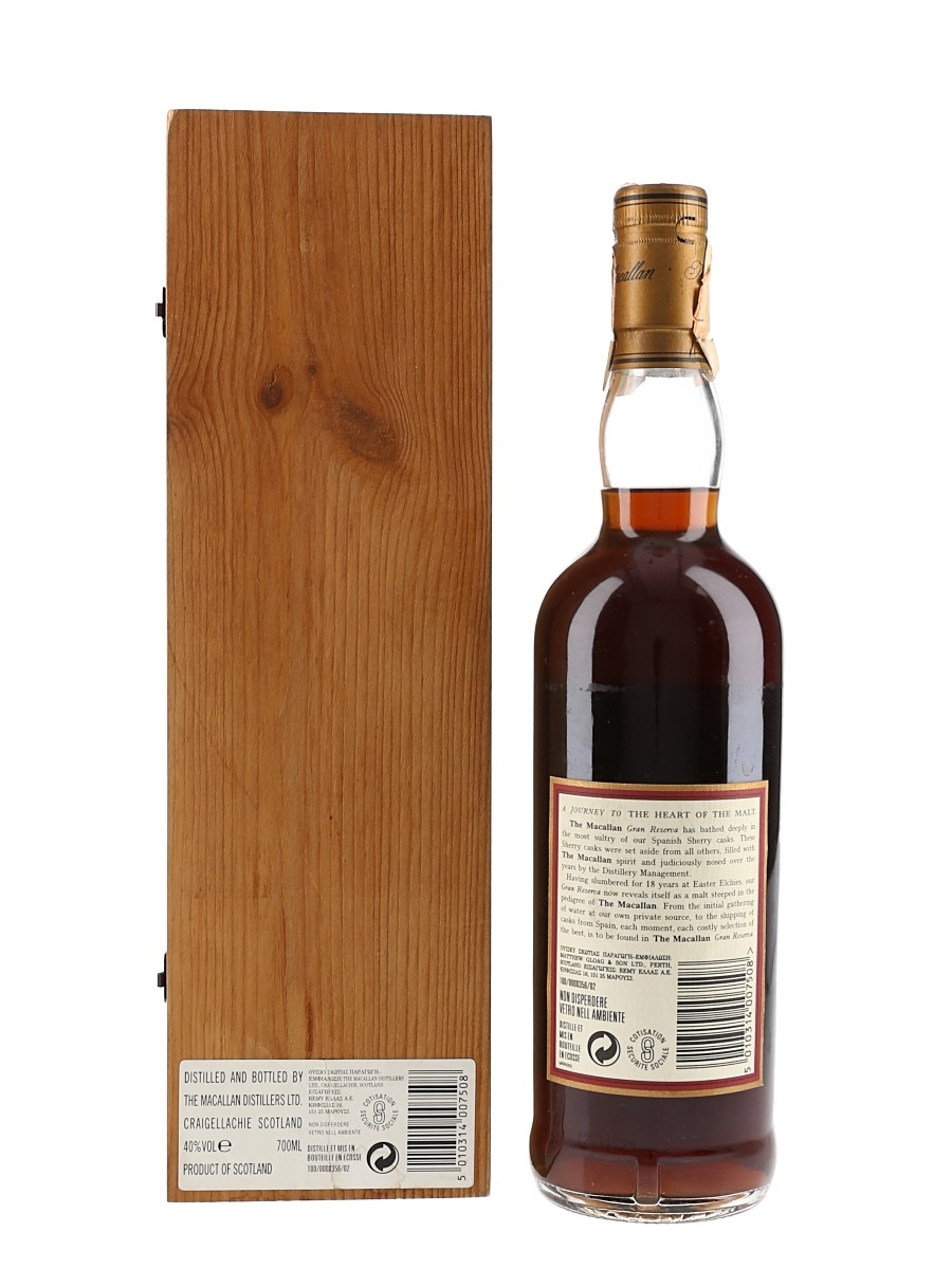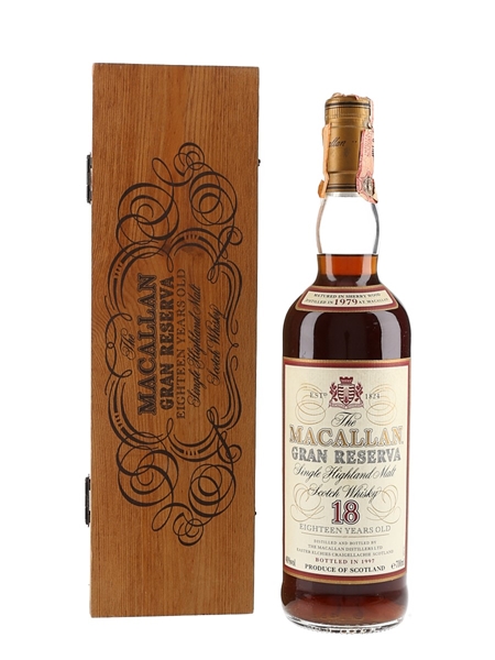 A bottle of The Macallan Gran Reserva 18 Year Old Single Highland Malt Scotch Whisky. This was distilled in 1979, matured in sherry casks and bottled in 1997.